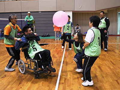 障害者と健常者が協力して勝利を目指す「第29回全国ふうせんバレーボール大会」が18年12月2日、北九州市であり、韓国も含め48チームの約460人が熱戦を展開しました。